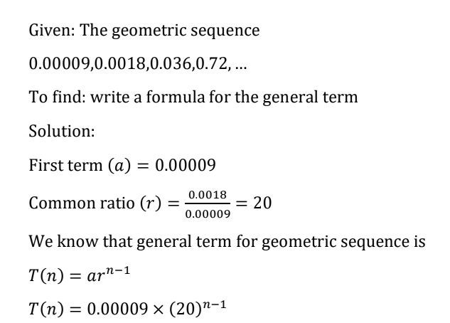 Write A Formula For The Nth Term Of The Following Chegg Com from d2vlcm61l7u1fs.cloudfront.net The first bounce is 8, the. How do you calculate arithmetic sequence? Hence, the 5 th term for the geometric sequence is 80. Find the common ratio by dividing any term by the preceding term. The geometric sequence formula is given as, gn = g1rn−1. Where, g n is the n th term that has to be found. How do you find geometric sequence? R is the common ratio.